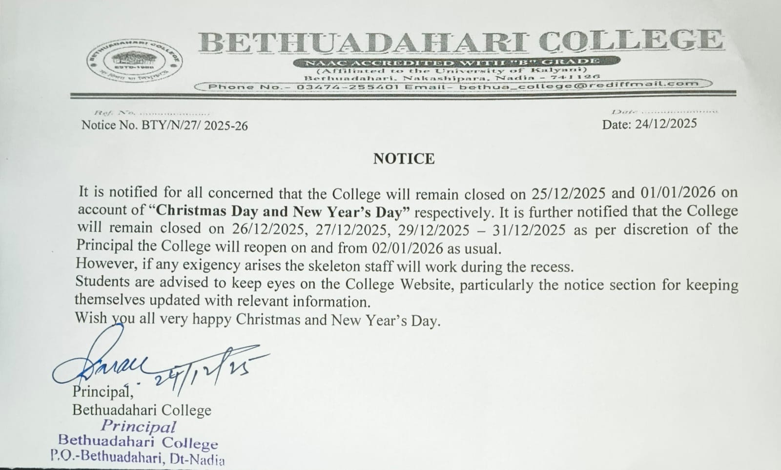 College Closed 25/12/2025 to 01/01/2026